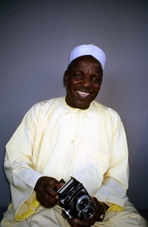 He decorated the "Photo Service" store of Gerard Guillat, also known as "Gégé la Pellicule", who offered him a job as his apprentice. That's how he got started in photography in 1956. He opened the "Studio Malick" in I958 in the centre of Bamako in Bagadadji, on 30th Street, Corner I9, where he still prints his portraits today and repairs cameras. The wildness of the 1950's, and the coming of independence, gave birth to a new generation of photographers who were totally involved in the cultural and social life that they recorded. Malick Sidibe, was a pivotal character in all this, highly appreciated by young people, he was present at all the soirees where the young, organized in clubs, learned the new dances coming from Europe and Cuba, and dressed elegantly in Western clothes. In I957 he was the only reporter in Bamako who covered all the events, festivities and surprise-parties. On Saturdays these parties lasted until dawn and continued on Sunday on the banks the river Niger. This on-the-spot coverage provided simple pictures, full of truth and complicity. From his photos an insouciance and spontaneity emerges: he captured the playful partying, full of laughter and life. He quit this activity in 1978, but continued his studio photography and repairing cameras. When his work gained an international reputation, new horizons opened up for him. People flock to his studio, magazines commission photo-reports, and he is invited almost everywhere in the world for exhibitions and conferences.