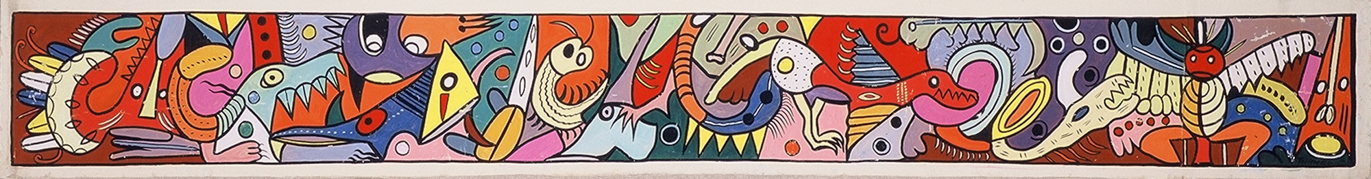 His huge frescos are painted in flat, monochrome colors and encircled with thick, black outlines. They lead us into a kind of imaginary and primitive forest where the worlds of animals, plants, monster figures and stylized masks come together.