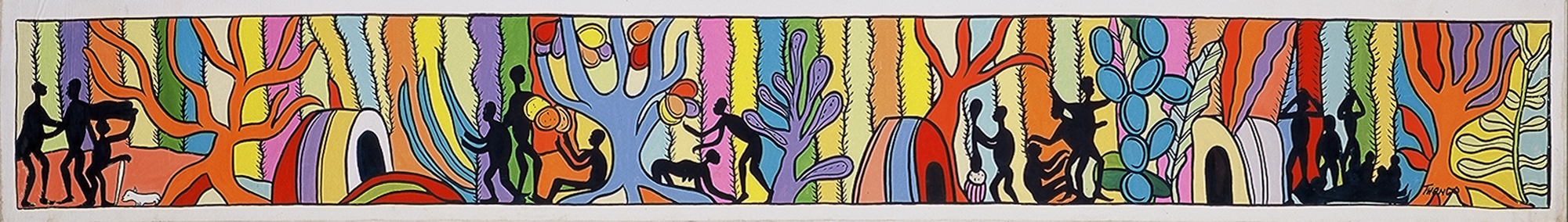Thango did not use an easel to paint. His technique involved using enormous narrow rolls of canvas, placed on a flat surface on which he would he would sketch in pencil. The visions, stories and questionings that appeared on the canvas undoubtedly came from his wanderings in the forest.