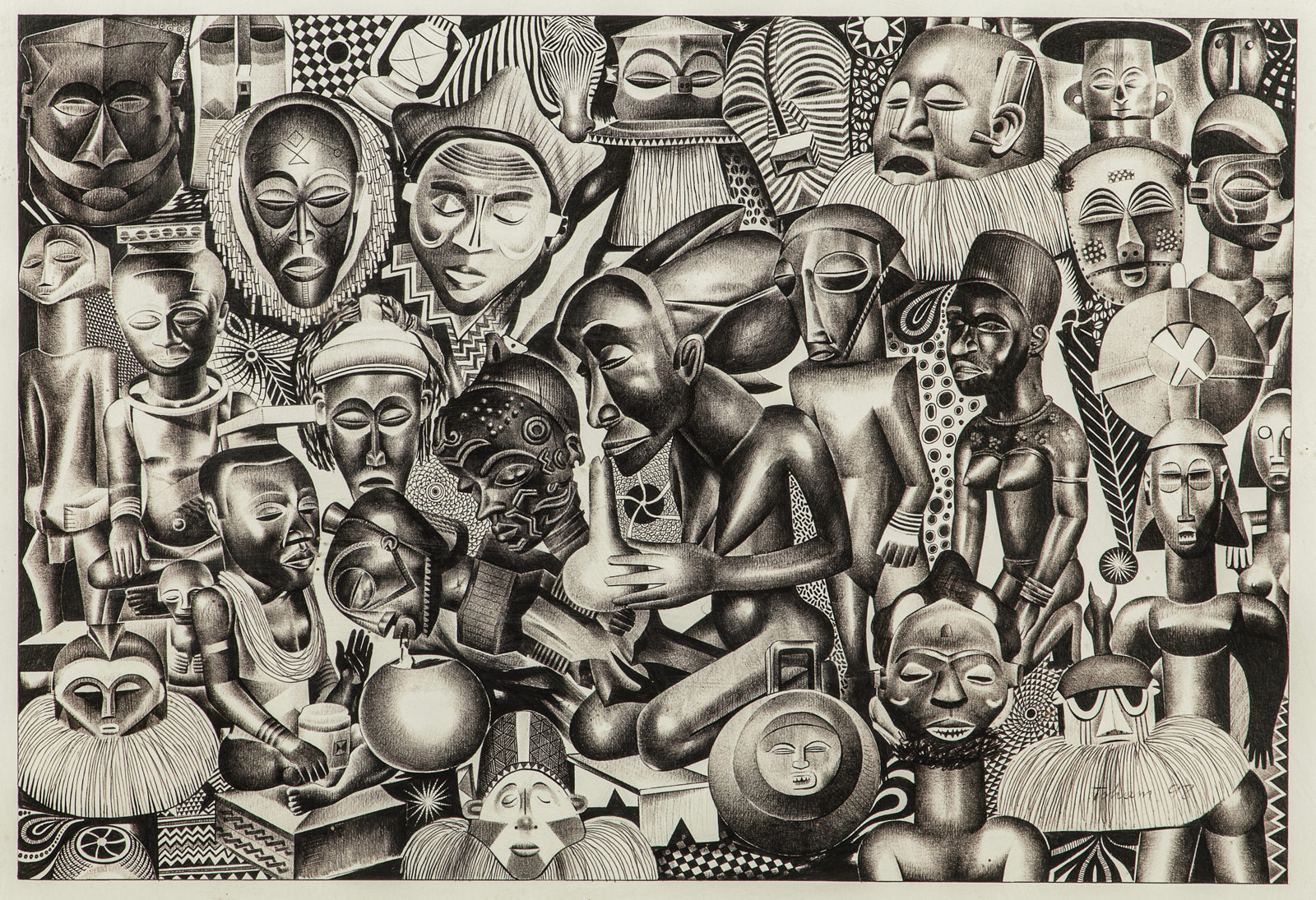 In 1984, he became a textile designer at Solbena, a local textile company, under the direction of Joseph Kabongo and Amisi, both great artists of the Lubumbashi school. The artist, who aspires to his creative freedom, resigns in 1986. He then went to Kinshasa where he enrolled as a free student at the Academy of Fine Arts. In spite of his talent, his limited means did not allow him to buy the material necessary to practice his art. To confront this difficulty, he finds the inspiration that will become his strength: the use of the black ballpoint pen! The ballpoint pen became Tsham's instrument of choice, allowing him to see his art explode. With a simple black Bic, he draws masks and statuettes from the Congo and elsewhere.